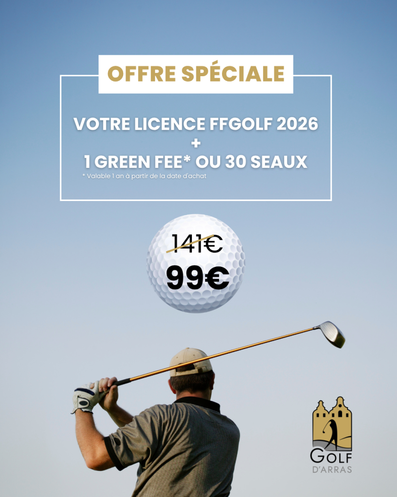 ATTENTION: Carottage des greens du 17 au 19 Mars 2026. Envie de découvrir le golf? Rien de plus simple, tous les dimanches, nous proposons une opération découverte de 9h00 à 11h00. Pour plus d'information et pour vous inscrire, rendez-vous dans la rubrique Académie du golf. Vous souhaitez (re)devenir membre du Golf d'Arras où convivialité rime avec nature et challenge? Rejoignez nous dès maintenant, nous vous offrons le mois de mars (voir conditions à l'accueil du golf, offre réservée aux personnes n'ayant jamais été abonnées ou n'ayant pas été abonnées depuis 2023). Déjà abonnés? Nous ne vous oublions pas! Pour tout renouvellement d'abonnement (hors abos jeunes -19 ans et -25 ans) avant le 15 mars 2026 payé au comptant, nous vous offrons 4 green-fees, 2 locations de voiturettes et 20 seaux de balles (rensiegnements en magasin). Début d'année rime avec renouvellement de licence! Profitez de notre offre à 99 €: licence 2026 + 30 seaux ou 1 green-fee 18 trous valable au Golf d'Arras jusqu'au 31/12/2026.